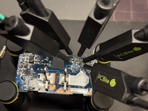 It is first required to put the microcontroller in download mode to enable flashing/dumping the device, which can be accomplished by powering up the device with TX0 connected to GND. This was easy work with the POGO pins on the PCBite, and after downloading ltchiptool in a virtual environment and connecting up the board (with TX0 pulled low for ~3 seconds to enable download mode) the current firmware was dumped: